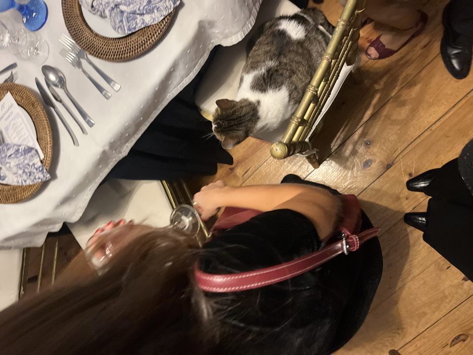 A table setting with plates, silverware, and glasses is visible under a white tablecloth. A tabby and white cat rests on a chair tucked under the table. A person wearing a black velvet garment and a red-strapped purse sits beside the chair. Feet of other people wearing dark-colored shoes and open-toed sandals are seen on the wooden floor.