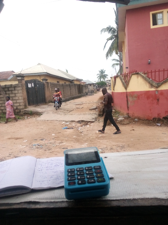 The image depicts an unpaved street scene in Zango-ndaji, Nigeria, under an overcast sky. In the immediate foreground, an open spiral-bound notebook with handwritten entries lies next to a blue Point-of-Sale (POS) terminal on a white surface. The street itself is composed of dirt and gravel, exhibiting visible potholes and scattered litter, including plastic debris. On the left side of the street, a woman in a light-colored, patterned dress walks from left to right. Further into the background, two individuals, with the passenger in a patterned garment, ride a motorcycle (okada) away from the viewer. On the right side of the street, a man wearing a dark-colored shirt and trousers walks from right to left, his gaze directed downwards towards an object held in his hands. He is wearing sandals. Residential buildings line the street. On the left, a single-story, light-yellow building with a pitched roof is partially visible behind a low concrete block wall and a dark, double metal gate. On the right, a two-story building painted reddish-pink features yellow trim, a decorative yellow and red fence along its base, and a visible window on the upper floor. Palm trees are identifiable in the background, interspersed among the structures.