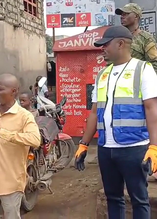 A group of people are standing on a street in what appears to be a town or city. In the center, a man in a light brown shirt is gesturing with his hands as if he is speaking. Beside him is a man wearing a white t-shirt, a blue and yellow vest, jeans, gloves, and a black baseball cap. There are several young people standing around the men. Behind the group is a red kiosk labeled "JANVIE". There is a motorcycle parked in front of the kiosk. A man in military fatigues stands behind the man in the vest. The environment is urban, with buildings and signs visible in the background. The street appears to be made of dirt.
