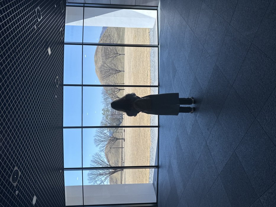 The image depicts an interior view from a modern building overlooking the Daereungwon Tomb Complex (Cheonmachong Tomb Park) in Gyeongju-si, South Korea. A single individual stands centrally in the foreground, facing away from the viewer and towards a panoramic wall of large glass windows. The person is silhouetted against the bright exterior, obscuring facial details. They have long dark hair and appear to be wearing a long, light-colored coat over dark pants, with light-colored shoes. A small backpack is visible on their back. The indoor space features a dark grey, textured tiled floor and a dark grid ceiling with recessed circular light fixtures. Large, clear, floor-to-ceiling glass panels, divided by dark vertical and horizontal frames, compose the back wall, offering an unobstructed view of the exterior. A white structural column is partially visible on the far right of the interior. Beyond the windows, a vast, dry, light brown/tan grassy field extends under a clear, bright blue sky, indicative of late winter or early spring. Several bare deciduous trees are scattered across the field. In the mid-ground and background, two prominent, large, rounded, grass-covered burial mounds (tumuli), characteristic of ancient Silla royal tombs, are distinctly visible. The leftmost mound is partially obscured by trees, while the rightmost mound stands more clearly defined.