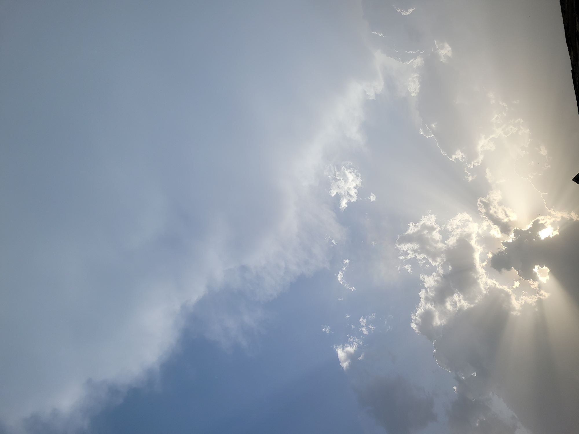 This image captures a sky scene in Nassarawan Eggon, Nigeria. The upper portion displays a clear to lightly overcast blue-gray sky, transitioning to a dense formation of clouds across the middle and lower sections. Bright crepuscular rays emanate from an intensely luminous, obscured light source, presumably the sun, located behind a heavy cloud bank towards the bottom-left quadrant. These rays extend upwards and outwards, illuminating cloud edges and creating stark contrasts between bright light and shadowed cloud masses. A dark, angular structure, consistent with a rooftop or architectural element, is visible in silhouette along the bottom edge of the frame. No individuals, animals, or specific identifiable objects are present beyond the described atmospheric and structural elements.