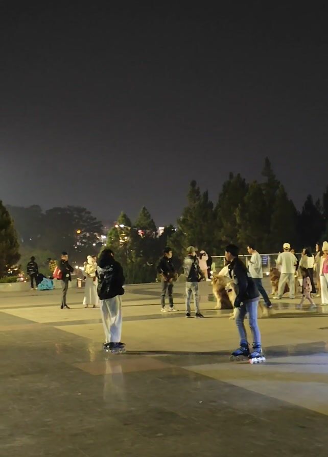 The scene is a public square at night, illuminated by artificial lights, with a mixture of people walking around and two individuals on roller skates. The skating individuals, both wearing dark jackets, move away from the camera, their roller skates visible. Various people are scattered throughout the square, some strolling, others standing in groups. To the right, two large dogs are lying down, seemingly resting. Tall, dark trees are visible in the background, suggesting a park-like setting. The ground is a smooth, reflective surface, and the overall atmosphere appears relaxed and social.