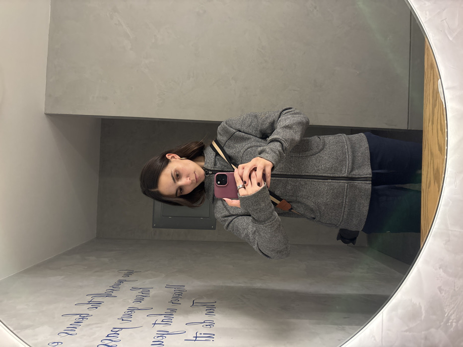 A young adult female is depicted in a mirror selfie taken indoors. She has medium-brown, shoulder-length hair and wears a gray zippered hooded sweatshirt, dark blue sweatpants, small hoop earrings, and a silver-colored ring on her left ring finger. Her fingernails are painted dark. A black and tan striped cross-body strap with a brown leather-like accent is visible over her right shoulder. She holds a dark pink/purple smartphone with both hands to capture the image, looking down at the device. The background, reflected in the mirror, features light gray textured walls, a white ceiling, and a light wood-toned counter below the mirror. Blue, reversed English script is visible on the left wall, reading in part, "...then do it. If you believe what you...". A dark gray rectangular panel is present on the back wall. The specific location within Mexico City is not discernible from the image.