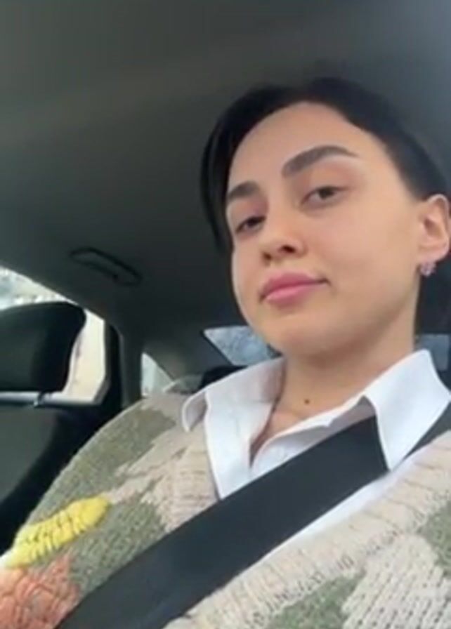 A young woman is sitting in a car wearing a seatbelt, a white collared shirt, and a colorful sweater. She gives a peace sign to the camera. The interior of the car is visible. The outside world is seen through the car's windows. Music plays in the background.