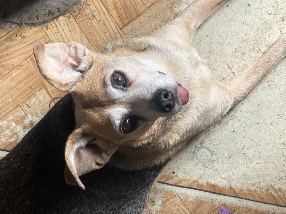The scene depicts a small dog lying on an indoor floor in Ushuaia, Argentina. The dog is primarily tan and light brown, with visible graying around its muzzle, suggesting an older age. Its dark eyes are open, focused directly upwards at the camera, and its pink tongue protrudes slightly from its mouth. Both ears are erect. The dog's body is partially visible, with darker fur present on its back, specifically on the left side of the frame. Its front legs are extended forward on the floor. The flooring consists of two distinct sections: a lighter, worn surface, possibly linoleum or tile, covers the right and bottom right portions of the image, while a section resembling light wood planks or laminate flooring occupies the upper left and left side. A diagonal line marks the transition between these two floor types. A dark, circular object, possibly a pet bowl, is partially visible in the upper right corner on the lighter floor surface. The lighting is direct, casting subtle shadows on the dog's left side.