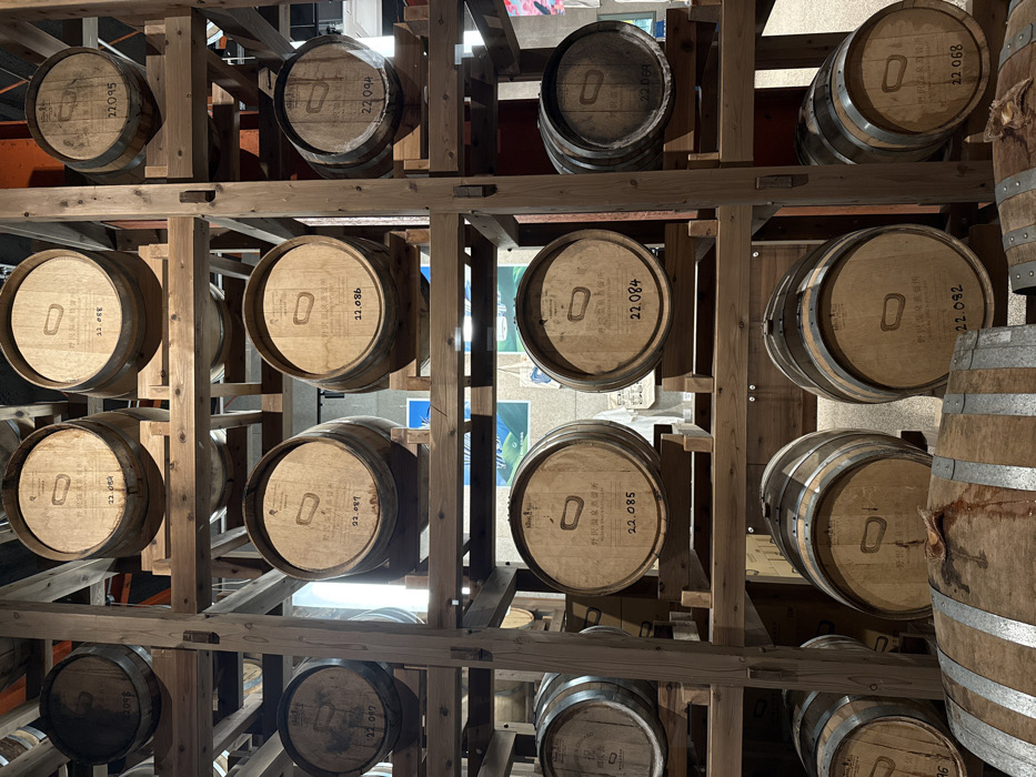 - "The image depicts an indoor scene within the Nozawa Onsen Distillery in Nozawaonsen, Japan, showcasing a multi-tiered wooden racking system holding numerous cylindrical wooden barrels" by FM-RAq1Q2, licensed under CC BY 4.0