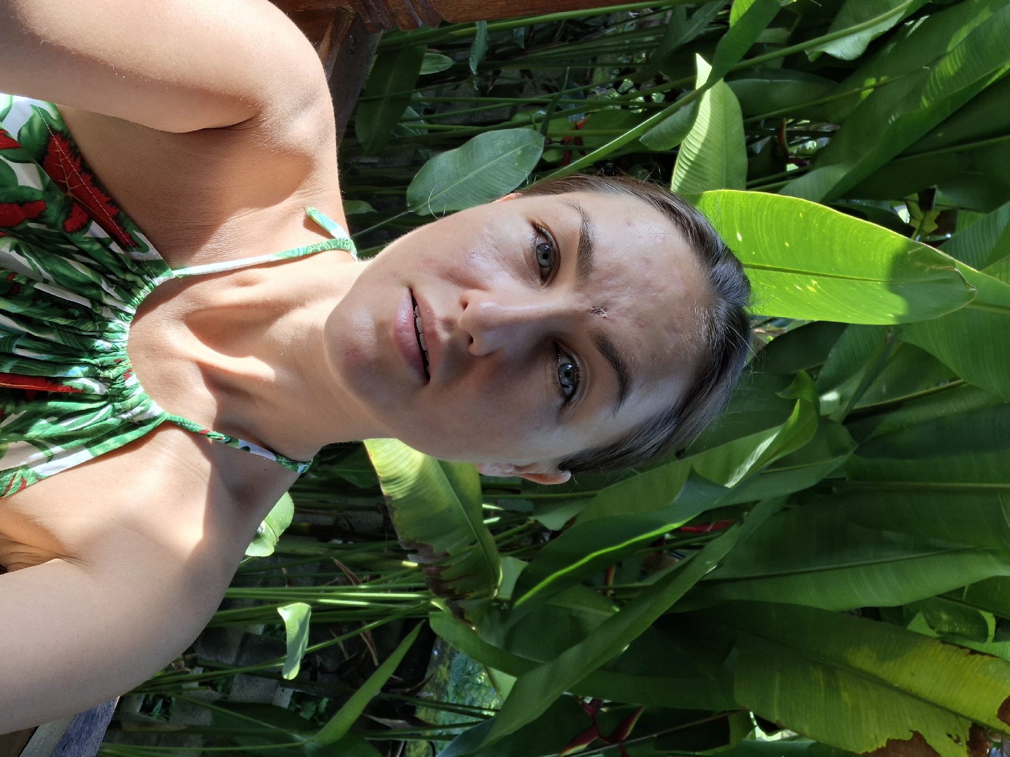The image is a selfie of a woman with fair skin and light-colored eyes, possibly gray or blue-green. She has dark hair pulled back from her face. A small scar is visible on her forehead near her hairline. She is wearing a green and white floral patterned top with thin straps. The background is a lush green environment, filled with large tropical leaves and some red flowers, typical of tropical foliage. The image was taken in the city of Lodtunduh, Indonesia.