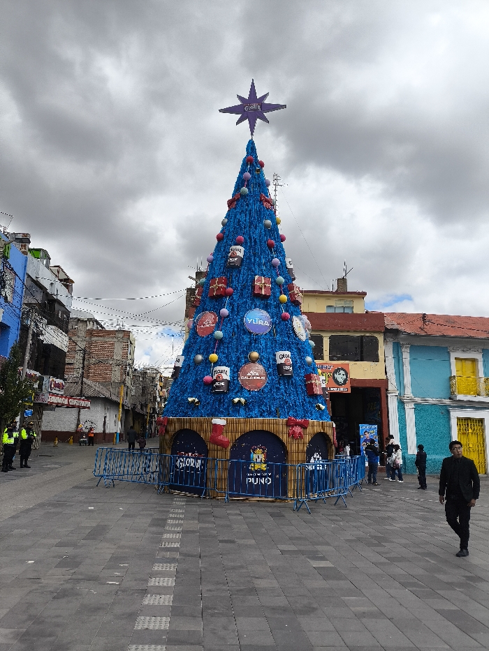 This image depicts a public square in the city of Puno, Peru, under an overcast sky with dense grey clouds. The central feature is a large, artificial Christmas tree, predominantly blue with a tinsel-like texture, topped by a purple multi-pointed star bearing the word "Gloria." The tree is adorned with various decorations including spherical ornaments in pastel pink, yellow, and light blue; red gift box ornaments with yellow ribbons; and circular disc ornaments displaying corporate logos such as "Gloria," "Yura," "Cacique," and "Leche GLORIA." The base of the tree consists of a multi-paneled brown structure, possibly wood-textured, featuring arched sections with festive graphics and prominent "PUNO" branding. Red Christmas stockings and bows are affixed to the base. A blue metal barrier encircles the tree's perimeter. The ground is paved with grey interlocking paver tiles, including tactile paving strips. To the left of the tree, several multi-story buildings are visible, showing a mix of construction materials including exposed brick, concrete, and painted surfaces, with one building featuring a prominent blue facade. Overhead utility lines crisscross the scene. In the left foreground, two individuals in dark uniforms with reflective yellow vests stand. Further down the street, indistinct figures are present. To the right of the tree, a two-story building with a yellow upper facade and dark windows is partially visible, displaying a large poster with a human face. Adjacent to it, a vibrant turquoise building with yellow balcony railings and a yellow ground-level door stands. Near the base of the tree and the entrance of the yellow building, approximately five individuals are gathered. In the right foreground, a male individual dressed in dark clothing (black jacket, black pants) walks towards the viewer.