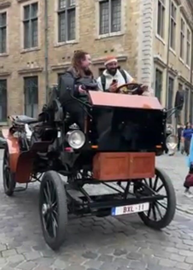 A video shows a vintage car with two passengers sitting in it. The car is black with dark brown wooden details and has a license plate reading BXL-11. It is parked on a cobblestone street in front of buildings with old European architecture. The person driving is wearing a white sweatshirt with brown and orange stripes and a red hat. They are gesturing with their hands and speaking to the passenger. The passenger is wearing a black jacket. The camera circles around the car, showing the building and other people walking by.