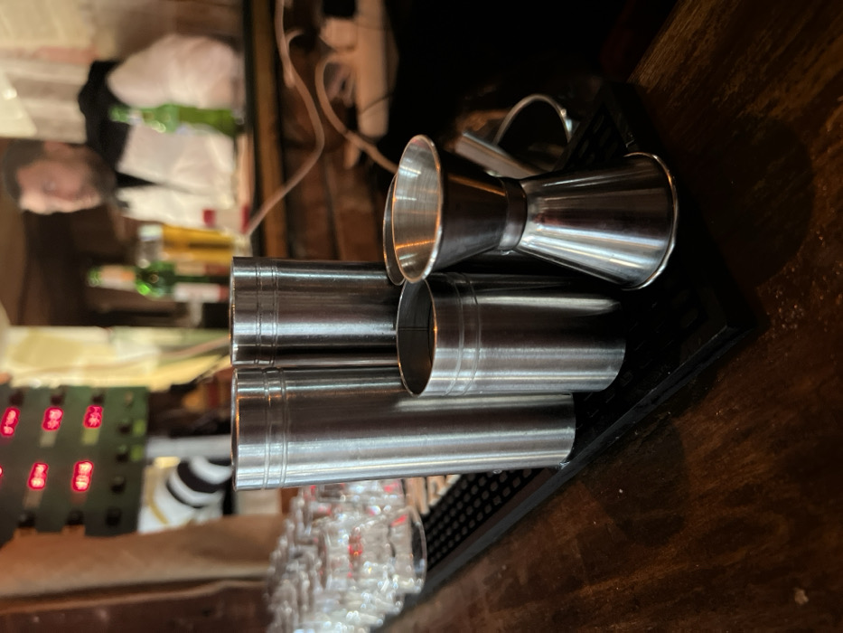 The image displays the interior of a bar in Sofia, Bulgaria, with a focus on bartending equipment positioned on a dark wooden bar counter. In the foreground, four stainless steel bartending tools are arranged on a black rubber mat: two tall cocktail shakers, one smaller mixing tin, and one double-sided jigger. To their immediate left, a row of inverted, empty clear glass tumblers is stacked on another section of the same black mat. The background is out of focus. On the right, a blurry male figure with a beard and short dark hair is visible, wearing a white jacket with a dark collar, appearing to be behind the bar. Behind him, a green beer bottle and a glass containing an amber liquid are present on the counter, alongside another blurred green bottle. To the far left, an electronic display with multiple rows of illuminated red numbers is partially visible. The overall environment suggests a dimly lit pub or cocktail bar, with faint brickwork visible in the blurred background.