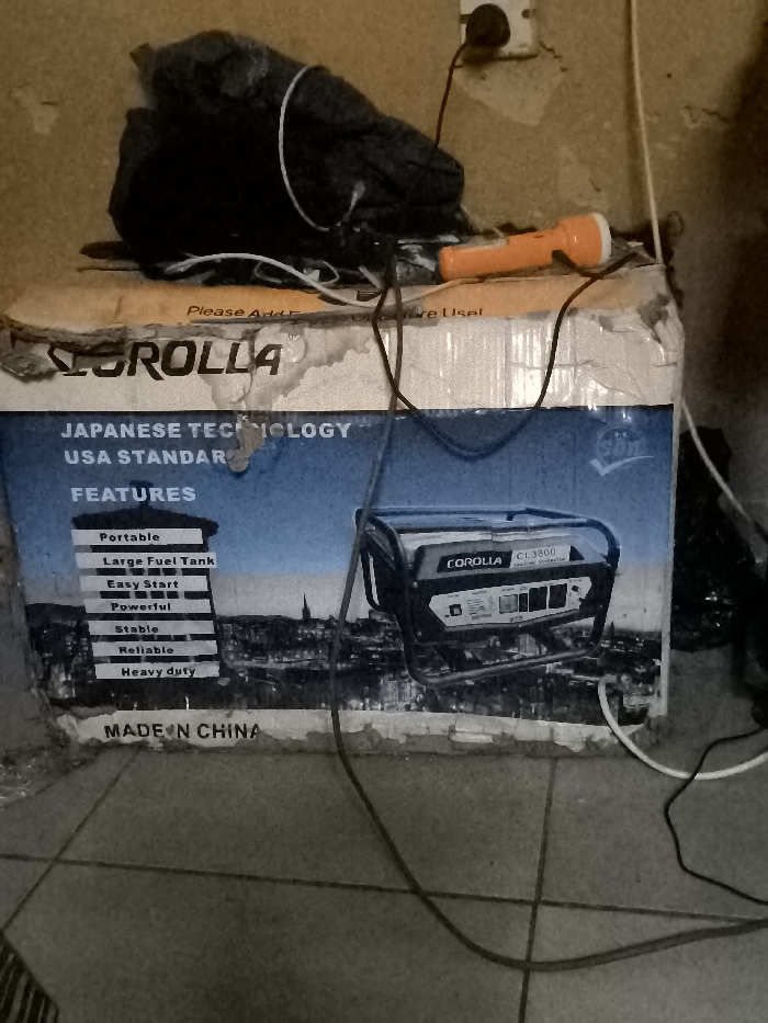 A cardboard box displays the branding "COROLLA" in large letters, followed by "JAPANESE TECHNOLOGY USA STANDARD FEATURES." A list highlights attributes such as "Portable," "Large Fuel Tank," "Easy Start," "Powerful," "Stable," "Reliable," and "Heavy duty." Below, "MADE IN CHINA" is visible. An illustration shows a "COROLLA CL3800" machine. On top of the box, there are several items and a black bag. The box sits on a tiled floor, with electrical cords and other wires scattered around.