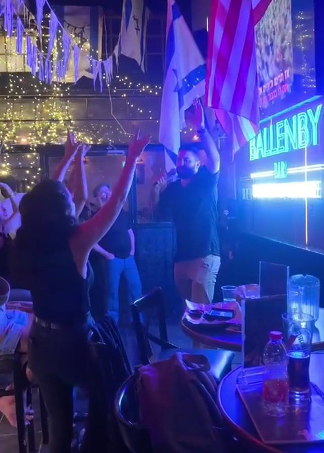 The scene captures the inside of a bar, where a group of people are standing with their hands raised in the air, appearing celebratory or enthusiastic. Among them, a man is holding an American flag and waving it energetically. The bar is decorated with both Israeli and American flags, along with strands of fairy lights, contributing to a lively and patriotic atmosphere. A neon sign that reads "Ballenby Bar" is visible in the background, further indicating the location. There are tables and chairs scattered around, suggesting a bar or pub environment. The lighting is predominantly blue and purple, enhancing the vibrant and festive mood of the space.