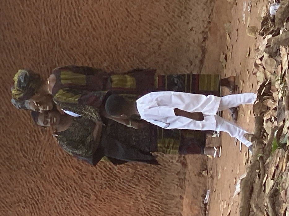 The image depicts a scene in Ochadam, Nigeria, featuring four individuals against a reddish-brown, heavily textured wall. In the middle ground, three adult females with dark skin tones stand in close proximity. The leftmost female, wearing a dark patterned top and wrapper with light open-toed sandals, smiles while embracing the central female with her left arm. The central female, dressed in a dark patterned outfit and matching headwrap, smiles and is embraced by both other women. A light-colored wristband is visible on her left wrist. The rightmost female, seen partially from the back, wears a similar dark patterned ensemble with a headwrap and dark sandals; her right arm is around the central female, and a subtle necklace is visible. All three women display expressions indicative of amusement or happiness. In the foreground, a young male child, also with dark skin, stands with his back to the viewer, observing the women. He is clad in a white traditional tunic and trousers. The ground consists of reddish-brown soil, sparsely covered with dry leaves, small branches, and roots, with a white plastic wrapper visible on the left.