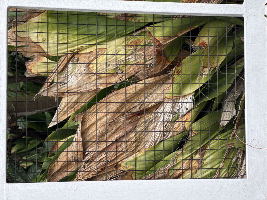 The image displays a close-up view of dense botanical foliage, observed through a dark, square-grid wire mesh. This mesh is framed by a rectangular, light-toned border, appearing to be composed of a thick, flat material such as painted concrete or wood. The plant material consists of large, broad leaves, varying in condition. Many leaves are vibrant green, while a substantial number exhibit advanced desiccation and browning, displaying fibrous textures and various shades of tan and brown, intermingled with the green foliage. The arrangement of leaves is dense, occupying the entire area behind the mesh. Within the deeper layers of the foliage, faint indications of darker branches and additional blurred green vegetation are present. No human figures, animals, or distinctive man-made objects are visible beyond the described frame and mesh. The scene suggests an outdoor botanical environment. The specific location within Amsterdam, Netherlands, cannot be determined from the visual evidence presented.