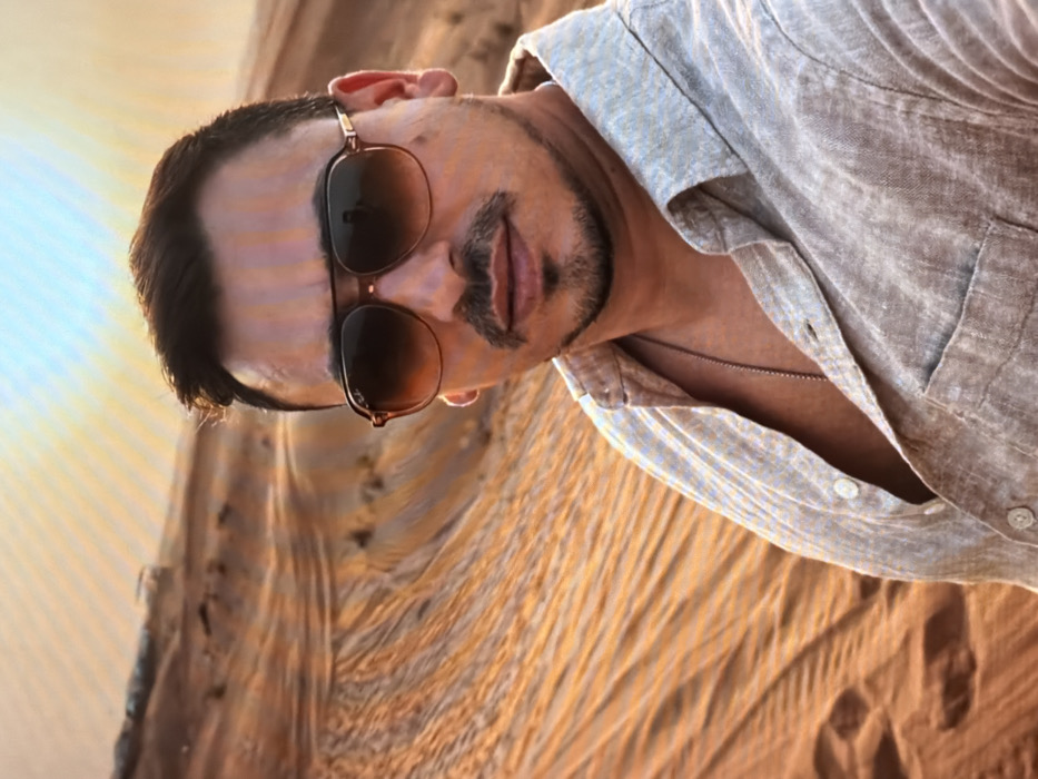 The scene is located in the city of Crawley, United Kingdom. A male subject is depicted in a close-up outdoor portrait, facing the camera with a neutral expression. He has dark hair, styled, and wears aviator-style sunglasses with brown tinted lenses, a 'Ray-Ban' logo visible on the left lens. He has a mustache and a short beard/goatee. The subject wears a light-colored, possibly linen, button-up shirt, unbuttoned at the collar to reveal a thin silver chain necklace. The background consists of extensive sand dunes exhibiting distinct ripple patterns, illuminated by warm, low-angle sunlight consistent with sunrise or sunset. The sky transitions from a light orange-yellow near the horizon to a paler blue/white above. In the upper left background, a dark-colored vehicle, likely an SUV or 4x4, is visible atop a distant sand dune.
