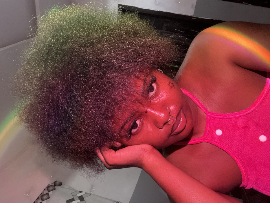 A person with a large, textured afro rests their head on a hand. Their skin glows with a vibrant red hue, possibly from lighting. They wear a pink top with white polka dots. The person has several piercings on their nose and lip, and a star tattoo near their eye. A rainbow effect is visible across the frame. The overall ambiance feels intimate and stylized.