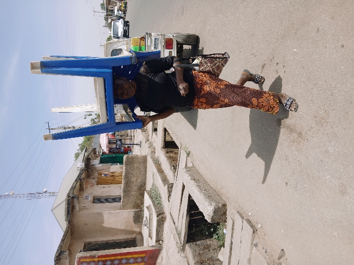 The image captures an urban street scene in Kwekwe, Zimbabwe, under clear daylight. A woman, appearing to be an adult, walks forward on a paved road, carrying two stacked blue and white plastic chairs balanced on her head. She wears a black long-sleeved top, a patterned brown and orange long skirt, and black sandals with silver embellishments; a patterned shoulder bag is visible on her left side. Her shadow is distinctly cast on the asphalt road to her right. To the left, a concrete sidewalk features open drainage channels with visible vegetation. Beyond the sidewalk, two single-story buildings with light-colored, possibly stucco, facades and corrugated metal roofs are present. One building shows a yellow door. Overhead utility wires span the scene, and a communication tower is visible in the distant background. On the road behind the woman, a white utility truck is present, followed by a white van and another smaller vehicle further down the street. The sky is clear and blue.