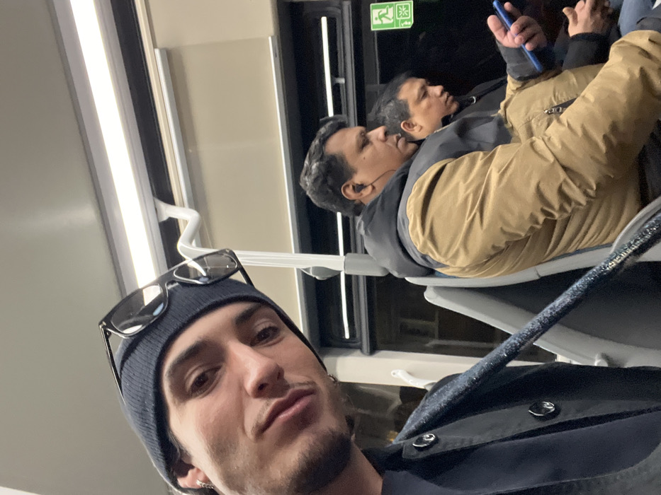 A selfie shows a man with a beanie and sunglasses perched on top, looking directly at the camera. Behind him, two men are seated. One is engrossed in a blue cell phone, while the other has an earphone. They are situated on what looks like public transportation seating with an emergency exit sign visible in the background. The overall lighting appears dim and the scene feels enclosed.