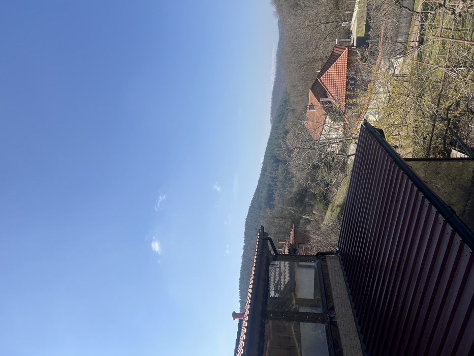 The image depicts a panoramic view of a residential area situated within a hilly, forested landscape in Poibrene, Bulgaria, under a clear blue sky. The upper half of the frame is dominated by a bright, cloudless blue sky with minor wisps of white cloud visible towards the center. A densely forested mountain range, appearing dark green with coniferous trees, occupies the distant background, spanning horizontally across the scene. The terrain slopes downwards from the forested areas towards the foreground. In the immediate foreground, to the left, a building structure is partially visible. It features a dark reddish-brown corrugated metal roof extending into the lower left quadrant. Above this, an enclosed area with transparent panels and dark wooden framing is discernible, topped by a traditional red clay tile roof with a red chimney stack. A black rain gutter runs along the edge of the corrugated roof. In the midground, several residential houses with pitched red clay tile roofs are observed nestled among mostly bare deciduous trees, indicating a late winter or early spring season. One prominent two-story house features light-colored walls and a reddish-brown tiled roof. Another similar structure is partially visible behind it. Patches of lighter vegetation and bare earth are present on the slopes. No individuals are present in the visible scene, nor are any specific actions or interactions discernible.
