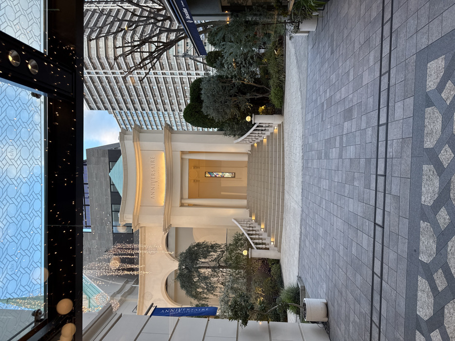 An outdoor pathway leads to a white building with the word "ANNIVERSAIRE" prominently displayed above the entrance. Staircases flanked by greenery and trees ascend on either side. A stained-glass window is visible through the doorway. Modern architecture looms in the background. The foreground showcases a window display with illuminated spheres. The ground is paved with geometric gray tiles.