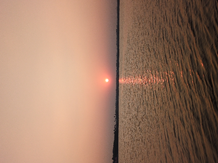 The image depicts a sunset over a calm body of water, likely a lake or large pond, within the city of Tiruvannamalai, India. The prominent subject is the sun, appearing as a bright, reddish-orange disc positioned low on the horizon, slightly above the distant landmass, casting a warm, golden-pink glow across the sky. A distinct, shimmering vertical reflection of the sun extends across the water's surface towards the foreground, characterized by ripples. The sky above is clear and transitions from a pale peach-pink near the top to a more intense orange-pink around the sun. A narrow, dark silhouette of distant land, possibly forested with scattered trees, forms a horizon line between the water and the sky. The water's surface is textured with gentle waves and reflects the warm hues of the sky and sun. No people, boats, or prominent man-made structures are visible. The environment conveys a serene, twilight atmosphere.