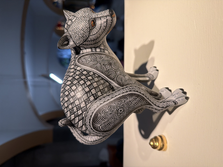 An Alebrije wolf figure, meticulously decorated with geometric patterns in black and white, sits on a pale wall, casting a shadow. The figure's head is tilted upwards, and its orange eyes stand out against the monochromatic design. A golden door knob is visible below, contrasting with the figure's intricate detailing and adding a touch of color. The background is blurred, suggesting an indoor setting.