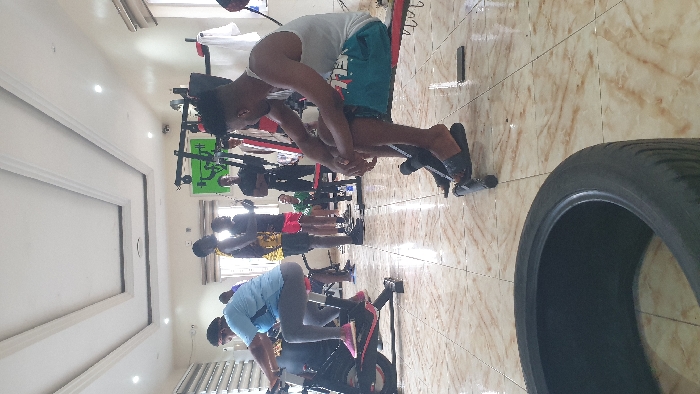 A group of people are exercising in a gym. One man bends over a weight bench, while others engage with various machines. A stationary bike is in use, and a tire is visible in the foreground. The gym has tiled flooring and a white ceiling.