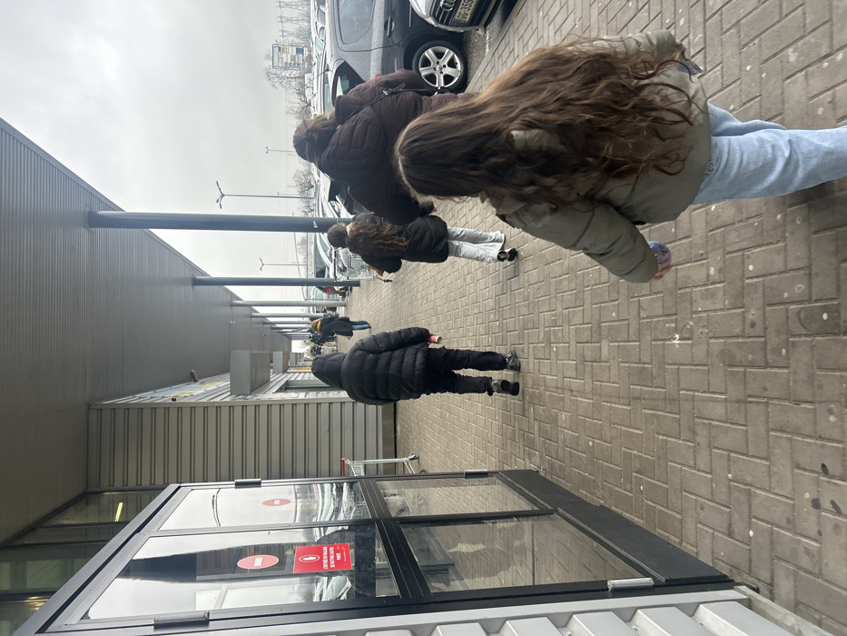 A line of people stands outside a store entrance on a cloudy day. The storefront is made of gray metal and glass, with a red sign on the door. A shopping cart is visible near the entrance. People wear winter coats and casual clothing. The ground is paved with gray brick. Cars are parked in the background. The view is angled down from above.