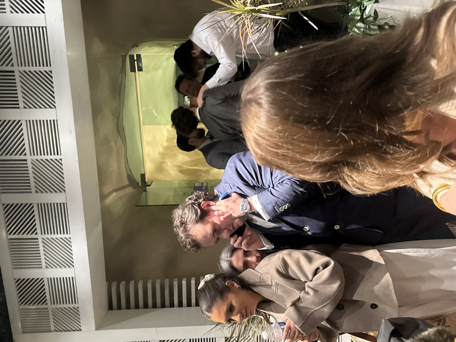 A group of people are gathered indoors. A man in a navy blue suit is talking on a cell phone, his wrist adorned with a watch. A woman in a tan coat stands beside him, holding a water bottle. Reflections of other people can be seen on a mirrored surface, including a man in a white shirt. A woman with brown hair is prominent in the foreground. The setting appears to be an upscale event or gathering.