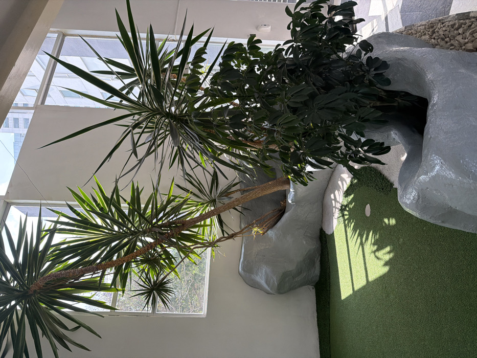 This image depicts a bright indoor space within a building in Jesús del Monte, Mexico, serving as a recreational or common area. The scene features an artificial turf putting green, prominent plant installations, and large windows. In the lower-left, a segment of a green artificial turf putting green is visible, including a single white-rimmed golf hole. Sunlight streams from the upper-left through tall, multi-paned windows, casting distinct shadows of window frames and foliage onto the green. Several large, irregularly shaped, light-grey rock-like planters are integrated into the environment. From these planters, multiple tall Yucca plants with long, spiky green leaves and visible woody trunks extend upwards towards the windows and ceiling. In the foreground, to the right, a denser, darker green plant with broader, multi-lobed leaves (possibly Schefflera) grows from a similar grey planter. The background reveals large, vertical windows through which the blurred outlines of a modern, multi-story building and some outdoor foliage are visible. The flooring to the right of the planters consists of light-colored tiles, interspersed with decorative pebbles or stones. Walls are plain white. No individuals are present in the scene, and no explicit actions or interactions are occurring.