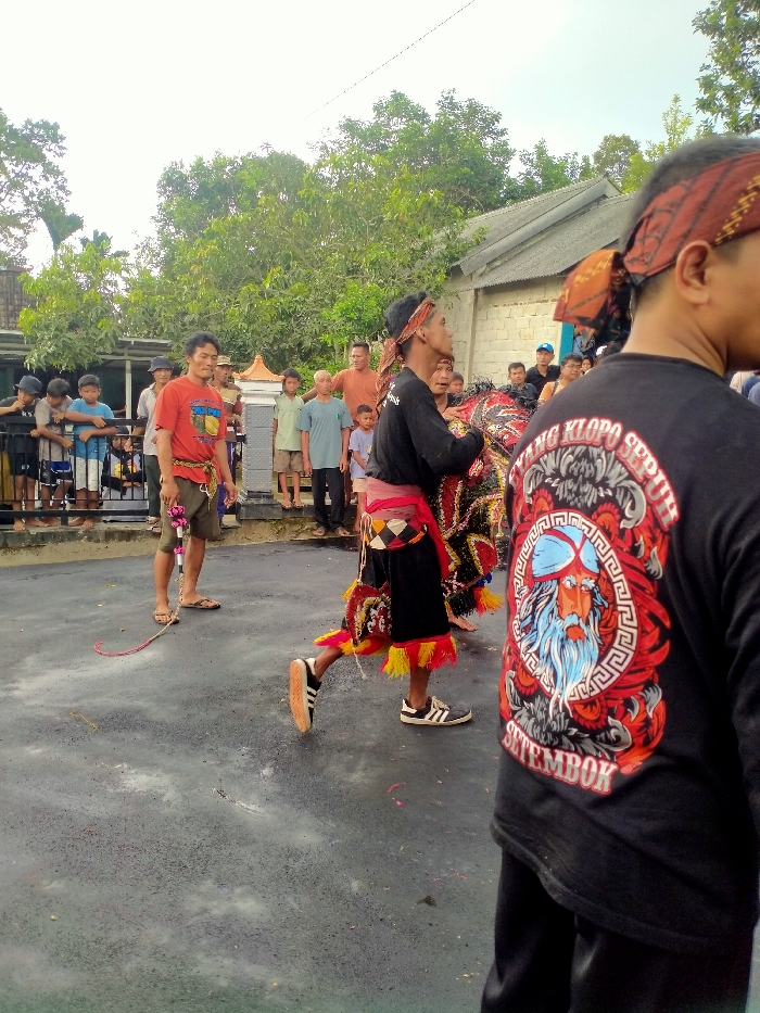 A group of people stand on a gray street. Some are onlookers. In the center, a man in black with colorful decorations walks, wearing Adidas shoes. Another person, partially visible, wears a black shirt with a design on the back, including a bearded face and the words "WAYANG KLOPO SEPUH SETEMBOK." A man with a red shirt and a rope is standing to the side, while another group of people observes from behind a fence. Trees and buildings are visible in the background.