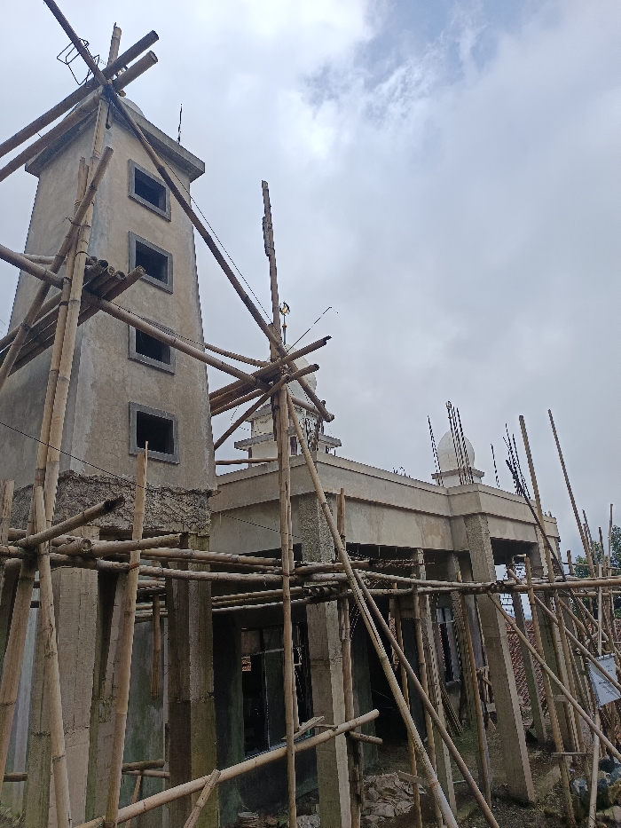 An under-construction building exhibits a tall, rectangular tower with three open window frames and a bamboo scaffolding system. A connecting structure with columns and a dome-like feature on top indicates a potential mosque or religious building. The overcast sky suggests daytime conditions. Construction materials and debris litter the foreground. The scaffolding appears to be made from bamboo poles, hinting at local or traditional construction practices. The building's exterior is rough, with unfinished concrete or plaster.