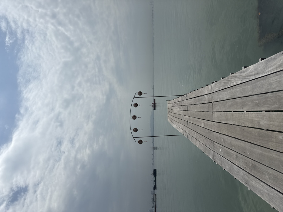 A wooden pier extends into calm, gray-green water. The planks are weathered and run diagonally towards the vanishing point. A decorative archway with spherical lanterns lines the pier. The sky is a mix of blue and cloudy gray, reflecting on the water's surface. Distant structures and boats are visible, barely discernible in the hazy atmosphere.