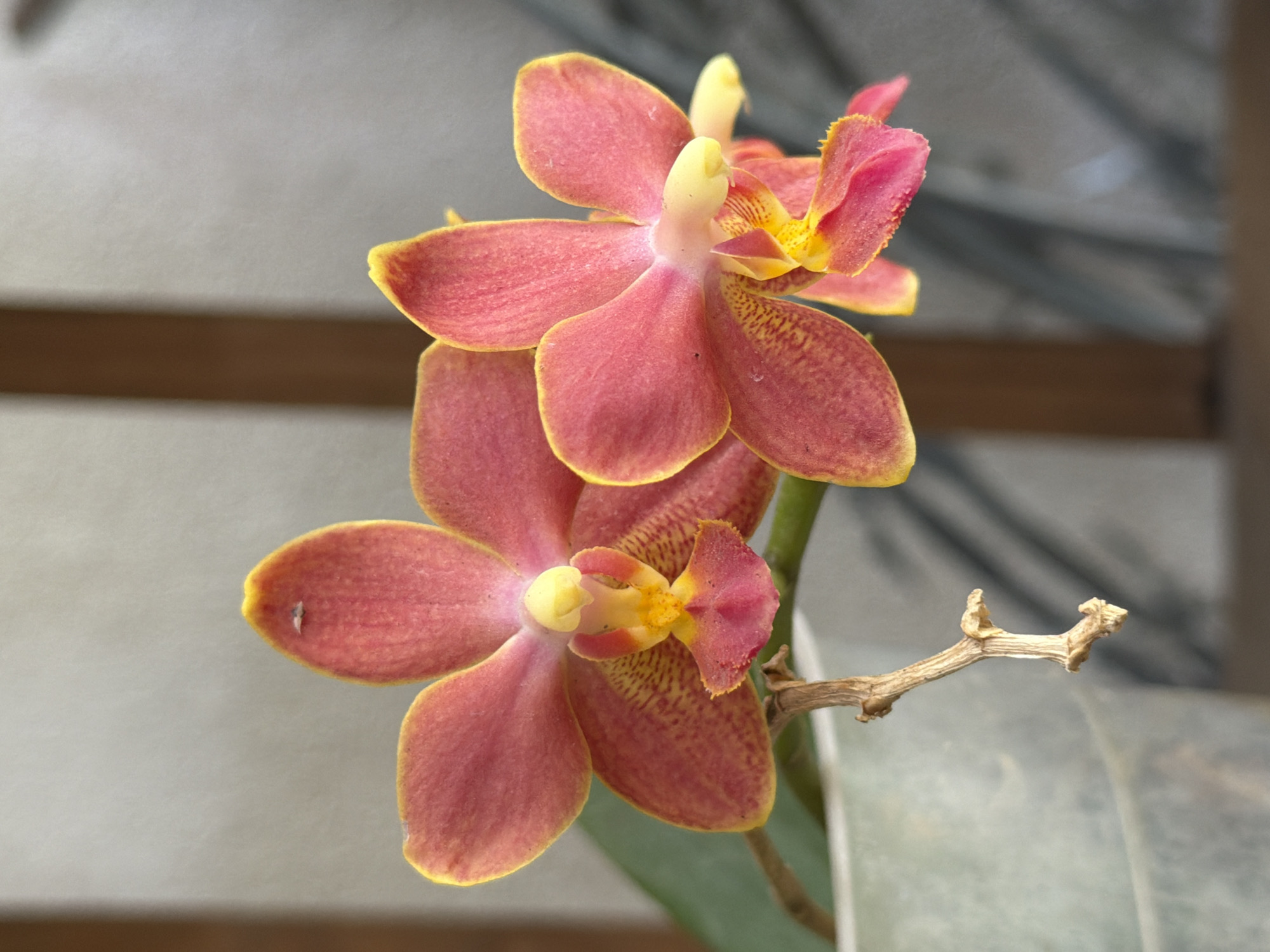 A close-up shot displays a cluster of two vibrant orchids, their petals a gradient of coral and peach, outlined with a delicate golden rim. The central structures of the flowers are a creamy yellow, with intricate patterns of orange speckles. A desiccated twig extends from the stem, contrasting with the fresh blooms. The background is blurred, suggesting a natural setting. The location is unspecified but is claimed to be Cuautla, Mexico.