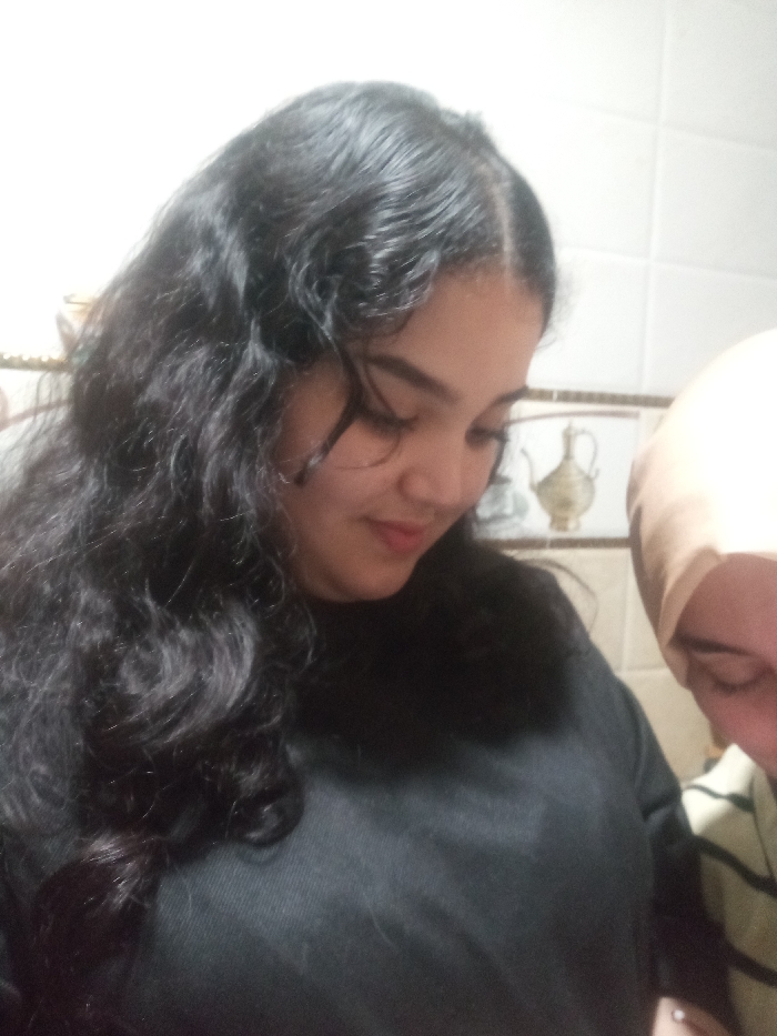 A woman with long, dark curly hair and fair skin is looking down with a slight smile. She is wearing a black top. Beside her, a person wearing a beige head covering is partially visible on the right. The background features light-colored tiled walls, with decorative tiles showing an urn or vase design.