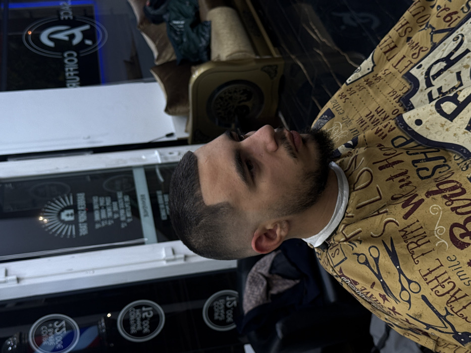 The image depicts an indoor scene within a modern barbershop or hair salon