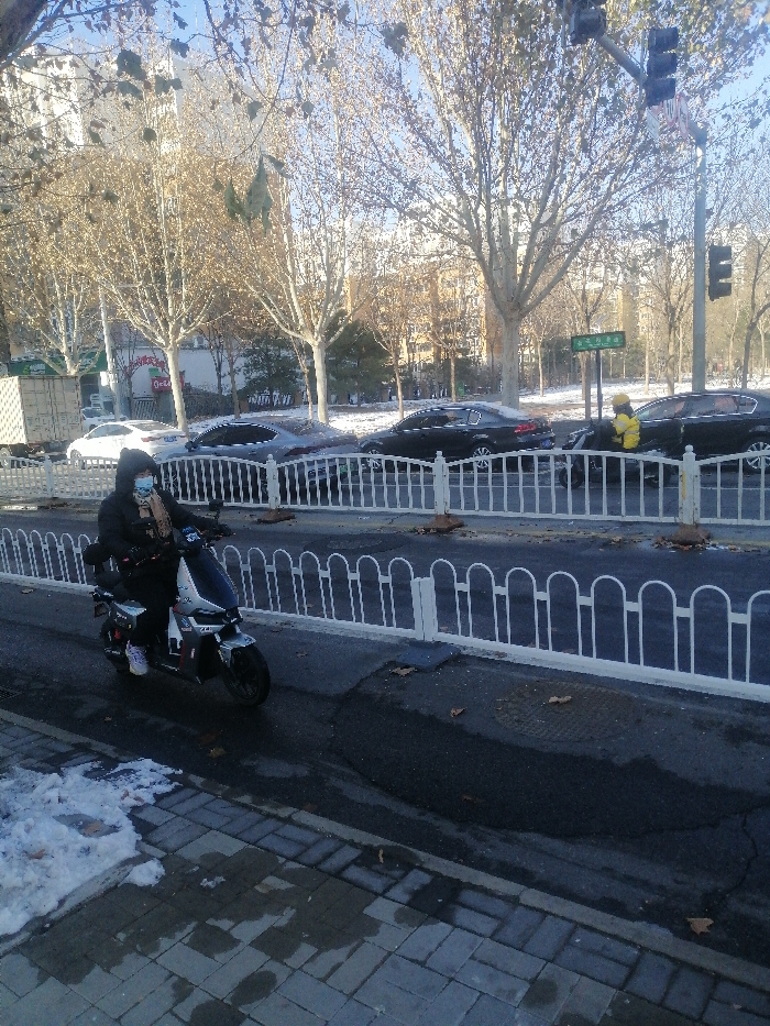 A person wearing a face mask and a dark jacket rides a silver scooter along a street. A white fence separates the scooter from parked cars covered in a light layer of snow. Bare trees line the background under a clear blue sky. A traffic light and street sign are visible in the distance. Patches of snow remain on the sidewalk. The road is wet, reflecting the sky.