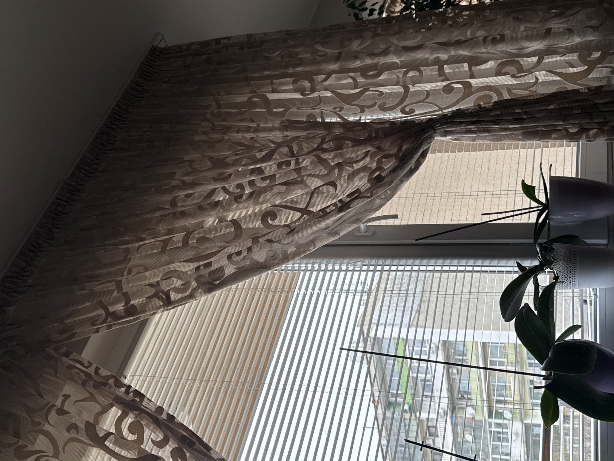 This interior photograph, taken in Varna, Bulgaria, displays a window view looking out onto an urban landscape. The window is equipped with white frames, horizontal Venetian blinds that are partially open at the top and fully closed in the lower section, and two panels of sheer, light brown fabric curtains adorned with a repeating scroll motif. The left curtain is partially drawn open, while the right curtain is tied back. On the white windowsill, three potted plants are arranged: one in a purple pot and two in white pots, with black support sticks visible in two of them, suggesting they are orchids. Beyond the window, through the blinds, several multi-story residential buildings are visible under diffused daylight. These structures feature numerous windows, balconies, satellite dishes, and air conditioning units. One building in the background is notably characterized by distinct green-painted sections on its facade. No individuals or specific activities are depicted in the scene.