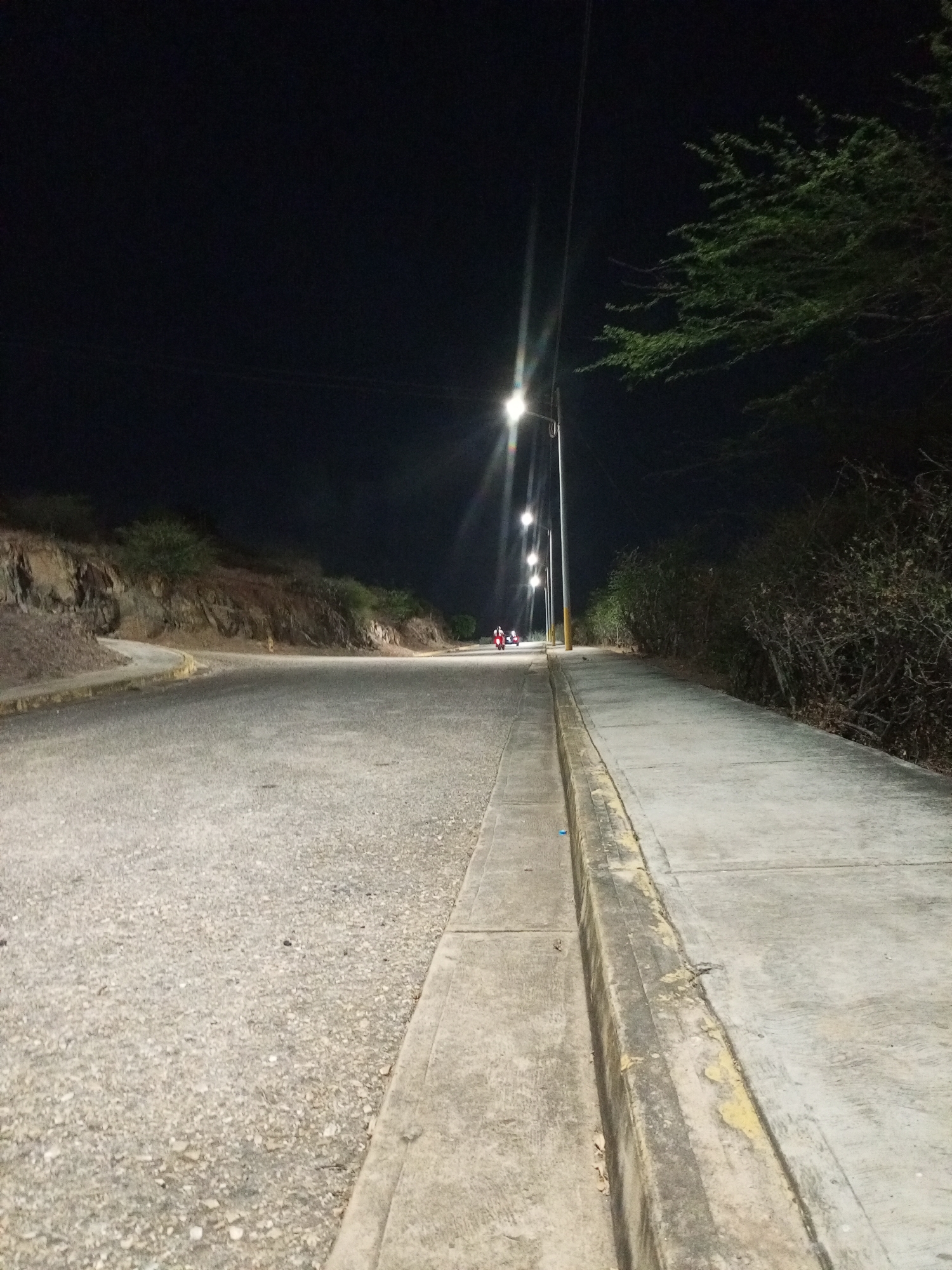 nighttime street scene in what appears to be Juan Griego, Venezuela. A concrete sidewalk runs along the right side of the frame, bordered by a low curb. To the right of the sidewalk, there are bushes. The street extends into the distance, curving to the left. Streetlights illuminate the road, and two figures riding on scooters can be seen under the lights. The left side of the road has a rocky hill and vegetation. The sky is dark.