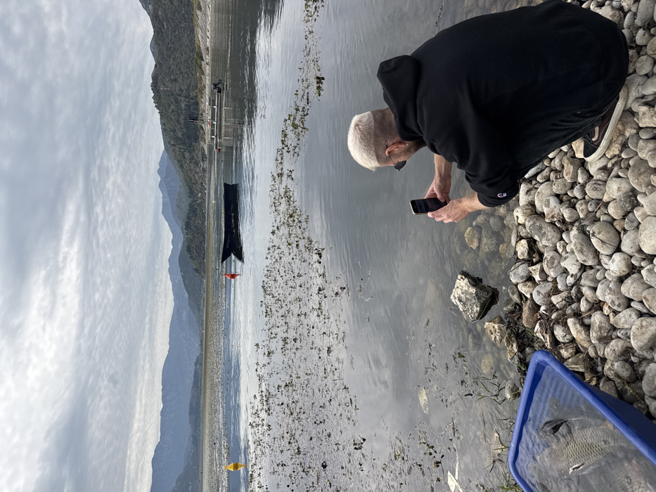 An adult male with bleached blonde hair, dark sunglasses, a black hooded sweatshirt, and dark trousers is observed crouching on a pebbled shoreline in Vranjina, Montenegro. He is holding a white smartphone horizontally with both hands, appearing to photograph or video the shallow water directly in front of him. To his left, a blue rectangular plastic container rests on the pebbles, containing a large, scaled fish partially submerged in water. The scene is set on a body of water, likely Lake Skadar, with distant mountains forming the backdrop under an overcast sky with textured clouds. The water in the midground contains patches of aquatic vegetation. Two buoys are visible: a yellow spherical buoy to the left, and a red cylindrical buoy closer to a dark, flat-bottomed boat with white lettering, moored in the water. Further to the right, a small dock or platform with a white structure and an outboard motor is visible near the shore. The shoreline consists of numerous light-colored, rounded pebbles.