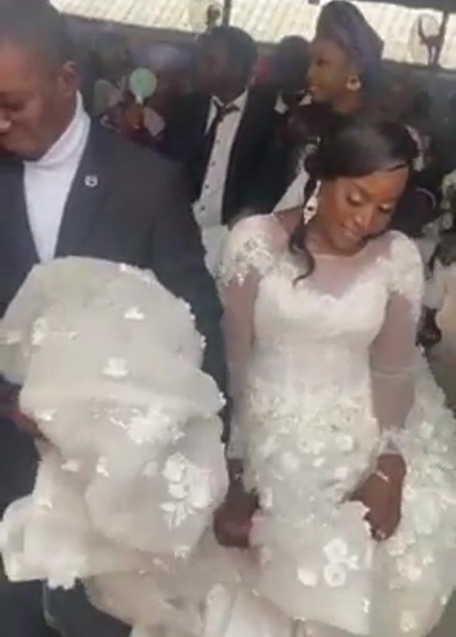 A woman in a white wedding dress walks through a crowd of people. She has dark hair swept back and is wearing jewelry. A man in a black suit walks beside her, carrying part of her dress. People in the background appear to be dressed in wedding attire. They are indoors.