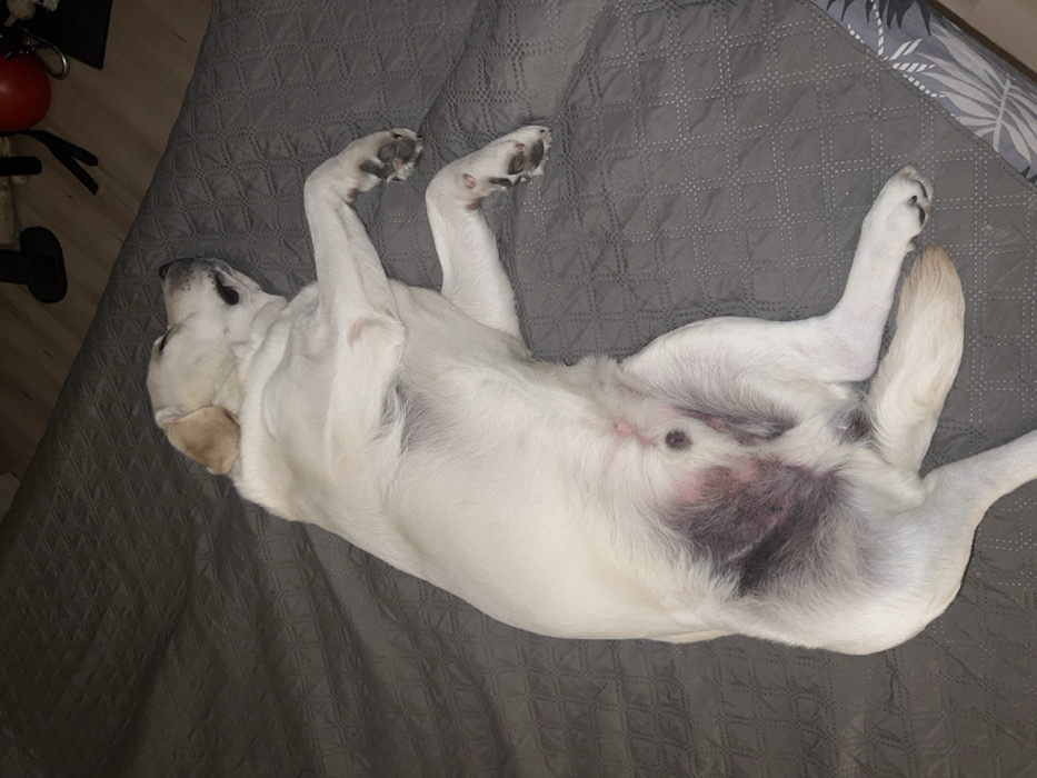 A cream-colored Labrador Retriever lies supine on a grey quilted bedspread in an indoor setting within Mytishchi, Russia. The dog's eyes are closed, and its mouth is slightly agape, indicating a state of rest or sleep. Its abdomen is exposed, revealing a distinct area of dark purple and reddish discoloration primarily on the left ventral and inguinal regions. A single nipple is visible on the abdomen. The dog's paws display dark markings. In the dimly lit background, a dark wooden floor and indistinct objects, including a red spherical item, are partially visible.