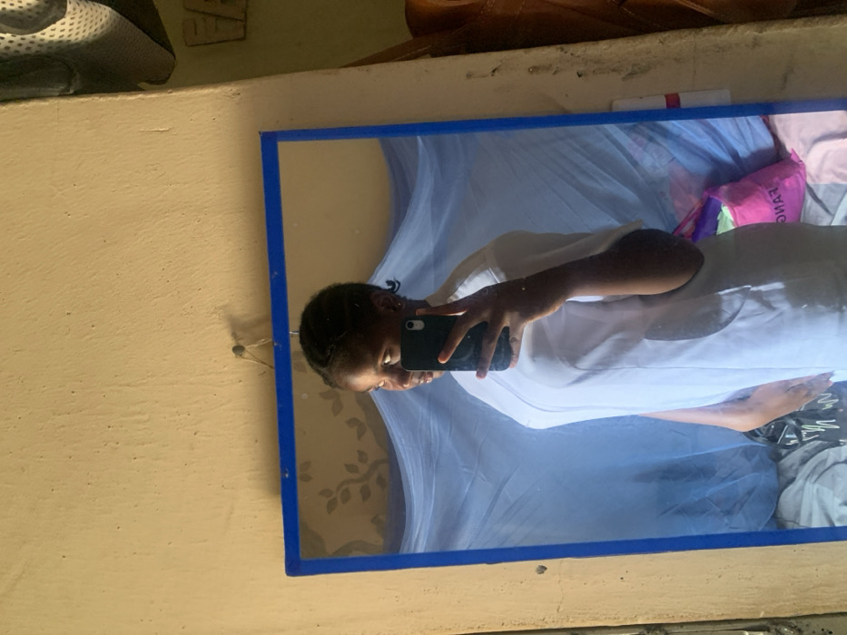The image captures a female individual taking a mirror selfie in an indoor setting in Kafanchan A, Nigeria