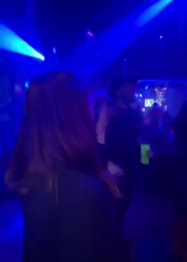 group of people dancing and talking in a nightclub