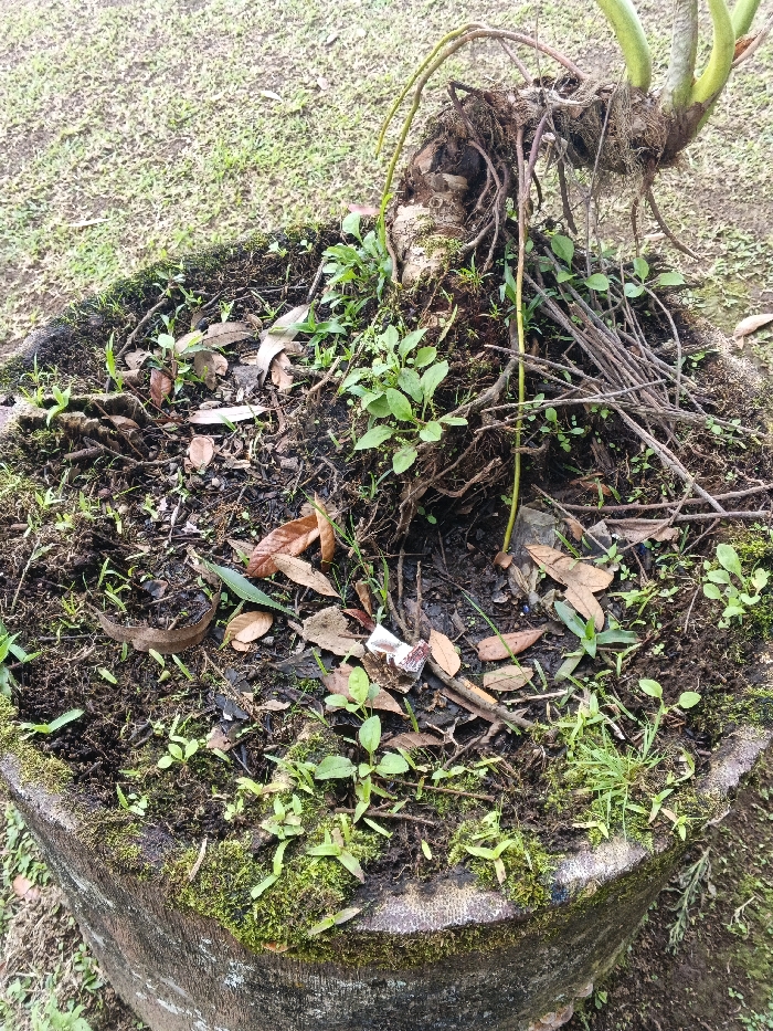 The image presents a detailed view of a weathered concrete planter located in Lokossa, Benin. The planter's rough, textured surface shows evidence of age and is partially covered by green moss, particularly along its upper rim. Inside the planter, dark, moist soil serves as a medium for various plant life and debris. A prominent plant with a thick, woody base and numerous exposed aerial roots emerges from the soil in the upper right, with a thick light green stem extending upwards. The soil surface is sparsely covered with small green seedlings, scattered dry brown leaves, and thin twigs. A small, crumpled piece of white and red paper or plastic is visible amongst the organic debris near the center-right. The immediate background shows a patch of short, light green grass. No individuals, animals, or active interactions are depicted in the scene.