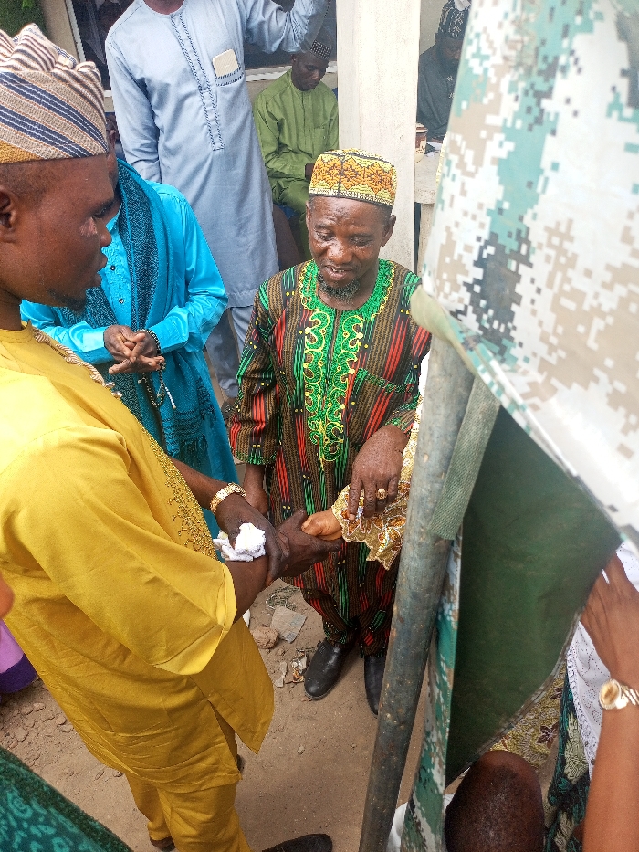 The image depicts an outdoor gathering in Erin-osun, Nigeria, centered around an interaction between several individuals