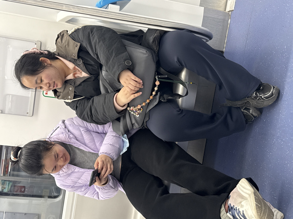 The scene depicts two East Asian women seated on a public transit vehicle, identified as a metro or subway car in Tiaodeng, China