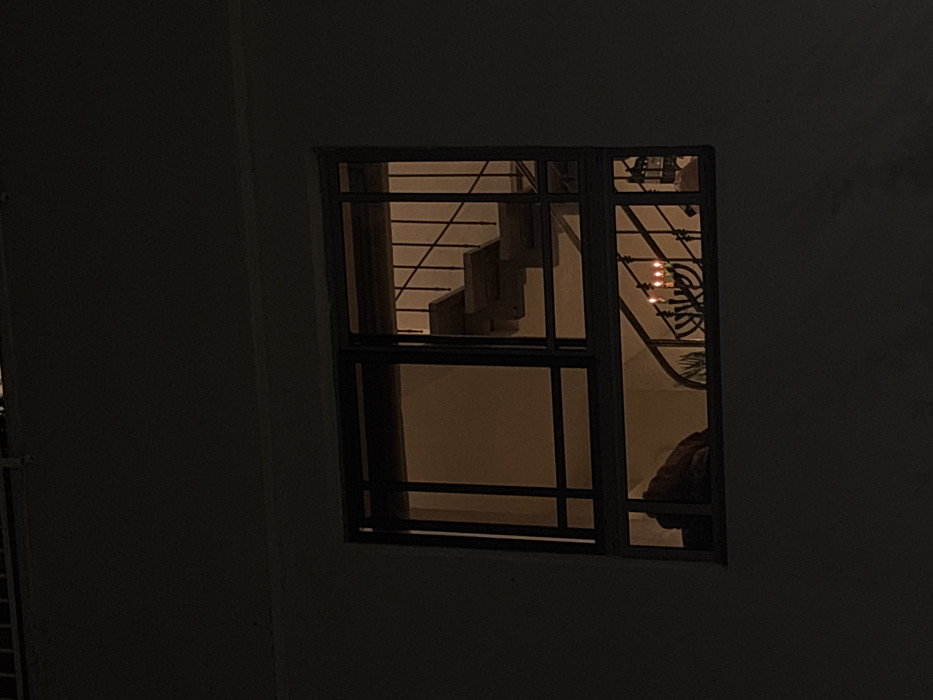 A window in a dimly lit room reveals a staircase with metal railing. Inside, a partially visible decorative piece glows with warm lights, possibly candles. A soft, undefined shape hints at an object or figure nearby. The exterior wall surrounding the window is dark, creating a stark contrast with the interior's illumination.