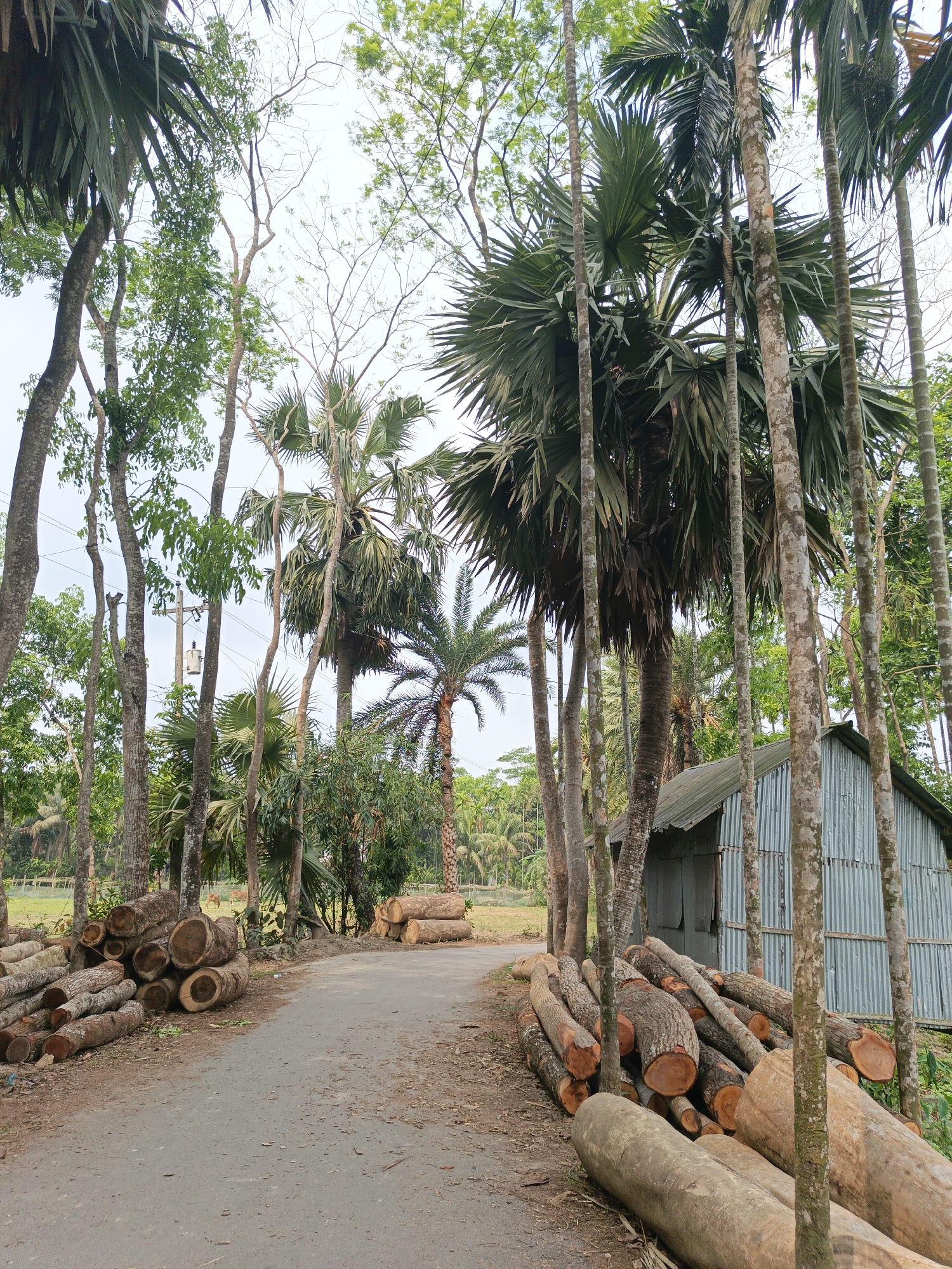 A rural road in Unknown, Bangladesh, is lined with stacks of logs on either side. Tall palm trees and other vegetation dominate the landscape. A small, corrugated metal shed stands to the right of the road. In the distance, a field is visible. The sky is overcast.