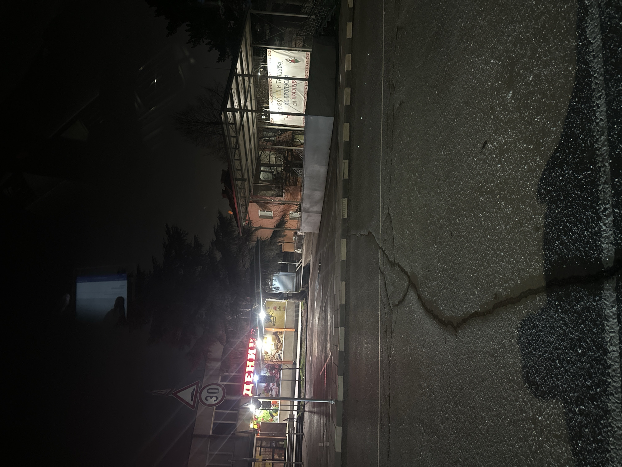 The image depicts a street scene at night in Voluyak, Bulgaria. A neon sign reading "ДЕНИ" (likely the name of a business) is visible, along with a triangular speed limit sign (30 km/h). To the right of the road, there is a covered area with a banner in Cyrillic text. The asphalt road appears wet and cracked. The lighting is dim, and the surrounding area is dark. The perspective is slightly tilted.